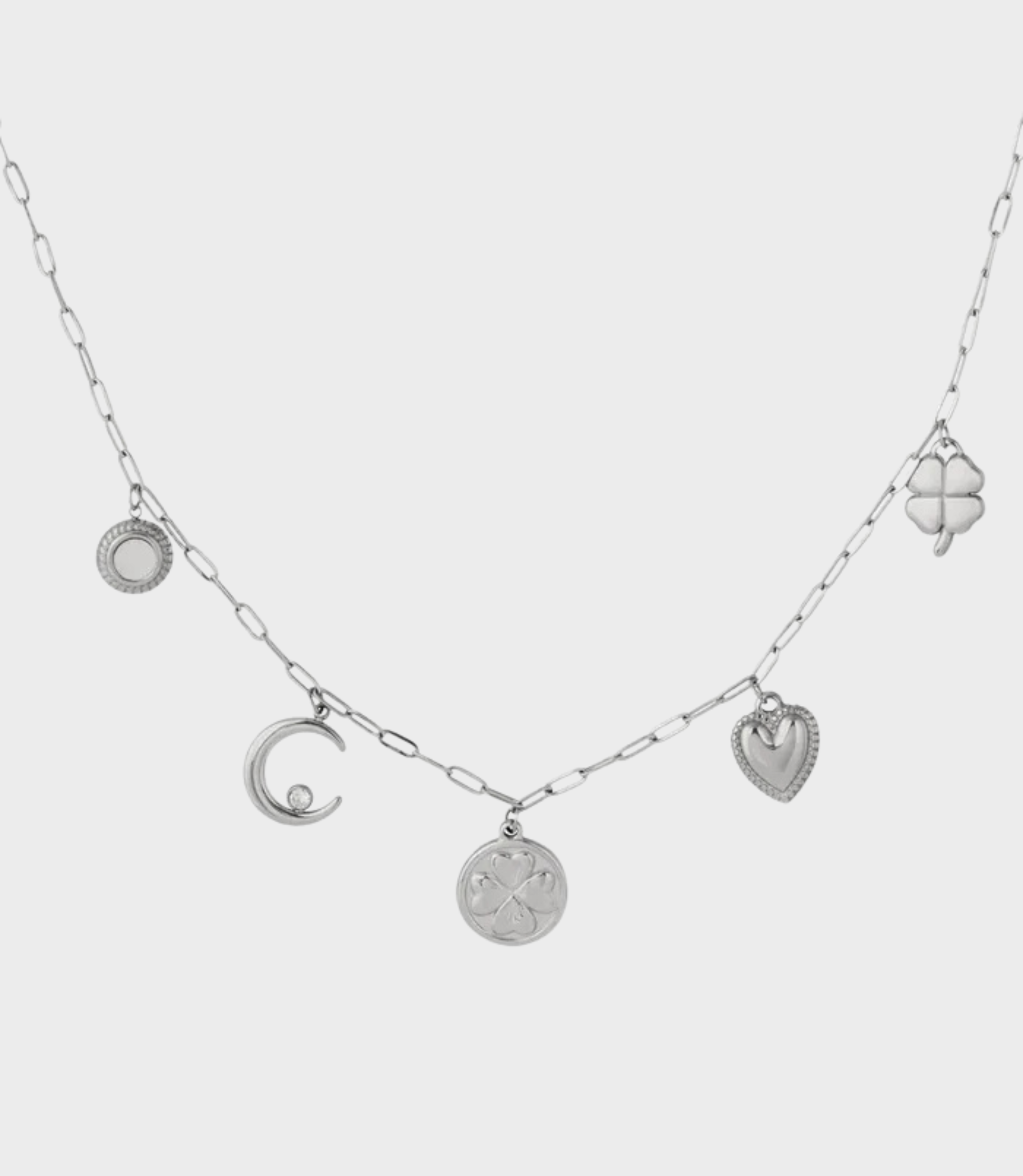 Collana con charm in acciaio inox, finitura argento waterproof e nickel free. Simboli iconici per un look personale e quotidiano.