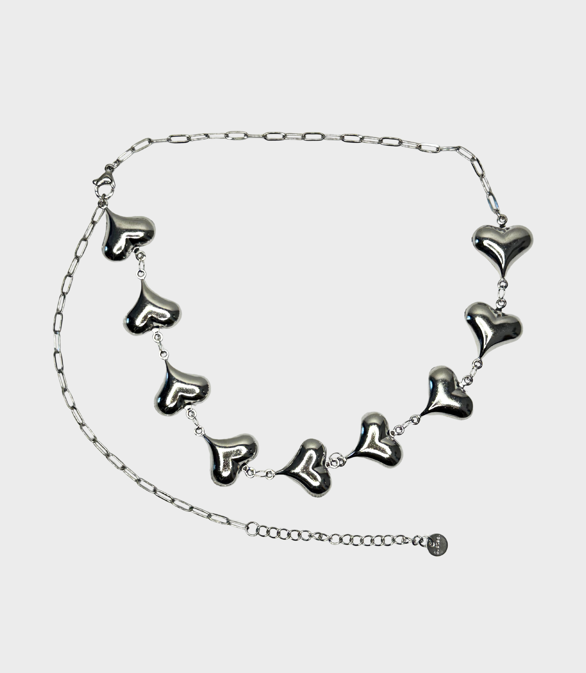 Collana con cuori in acciaio inox, waterproof e nickel free. Romantica e luminosa — indossabile in due modi: come girocollo o collana più lunga.